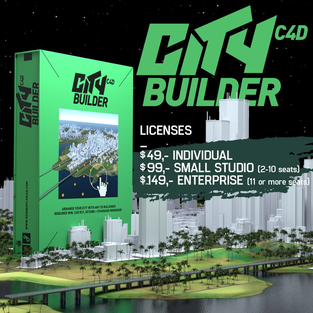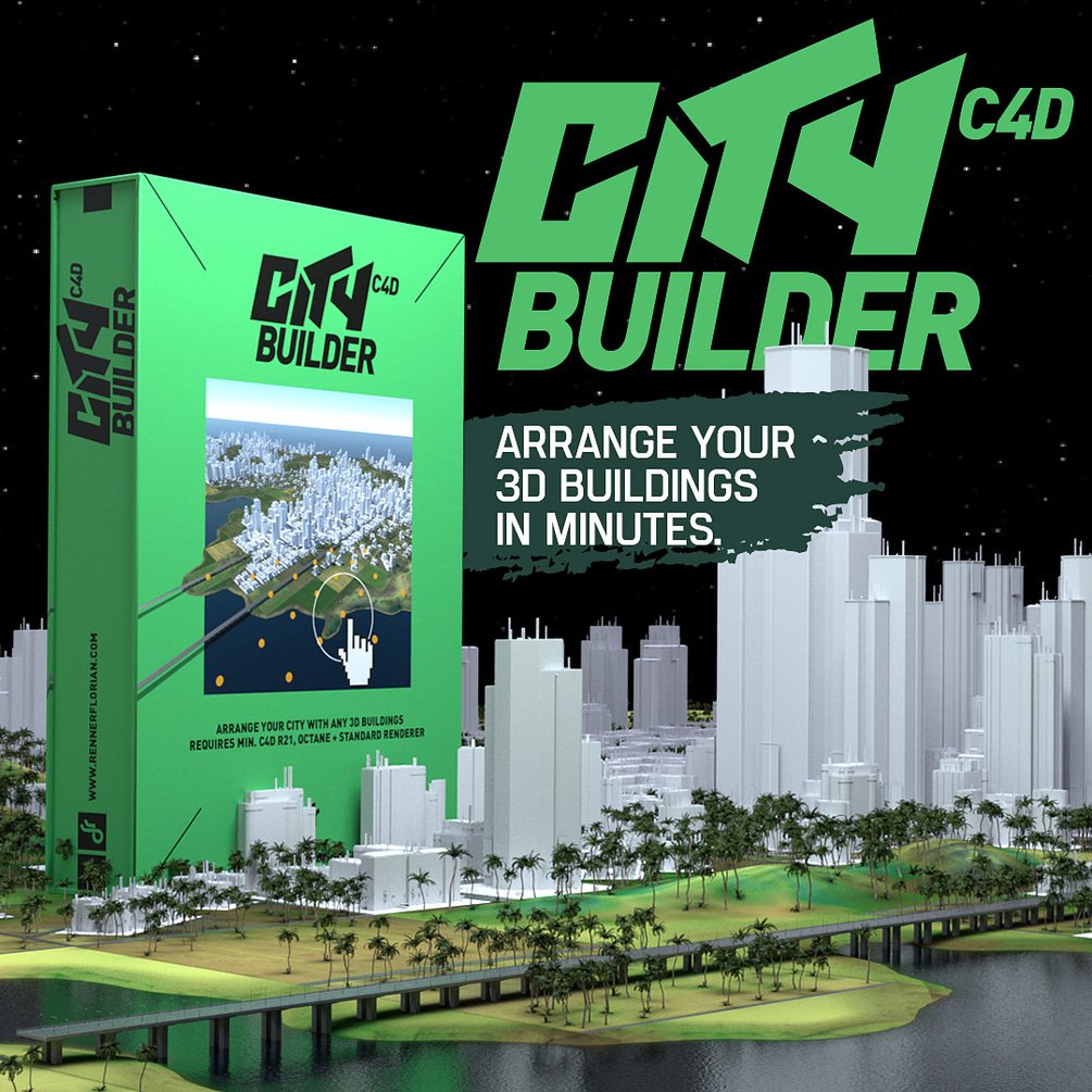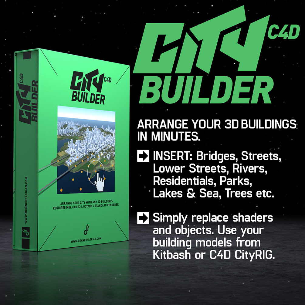 Arrange your 3D Buildings in minutes. With this Cinema 4D tool you're able to create cities with streets, bridges, rivers, lakes, hills and more. All elements are changeable and can be replaced with your own or purchased models.